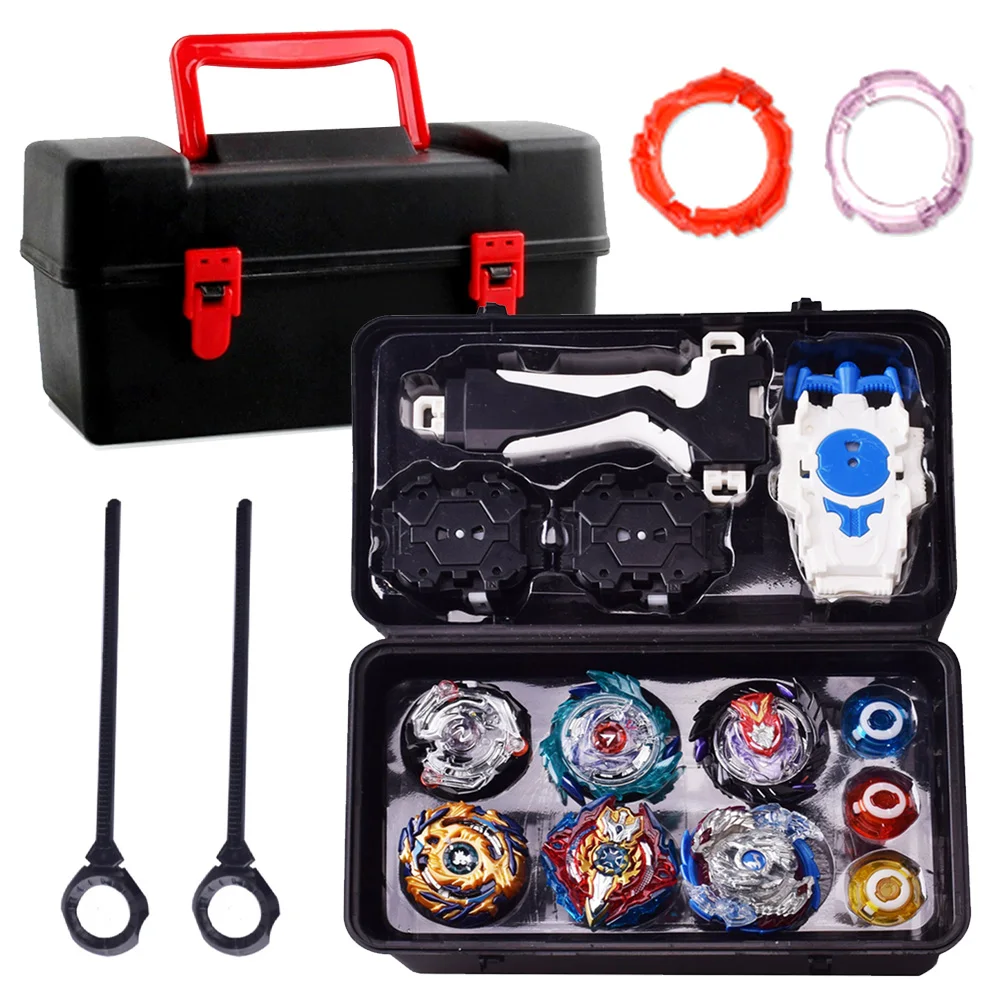 Une valise complète avec toupies, lanceurs et accessoires pour des combats épiques ⚔️.