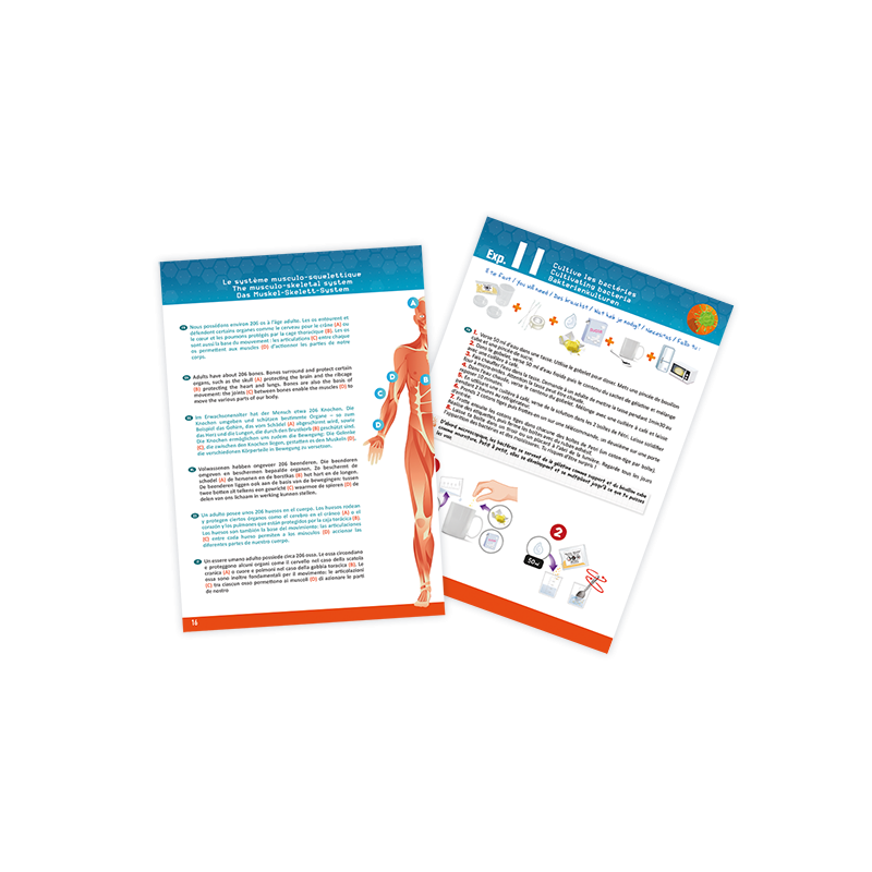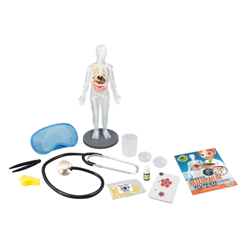 Ce coffret permet de découvrir l’anatomie avec un modèle complet du corps humain muni d’organes mous à disséquer et d’os phosphorescents. 12 expériences pédagogiques incluent : cultiver des bactéries, créer de la “morve” gluante, écouter le cœur avec un stéthoscope… Dès 8 ans.