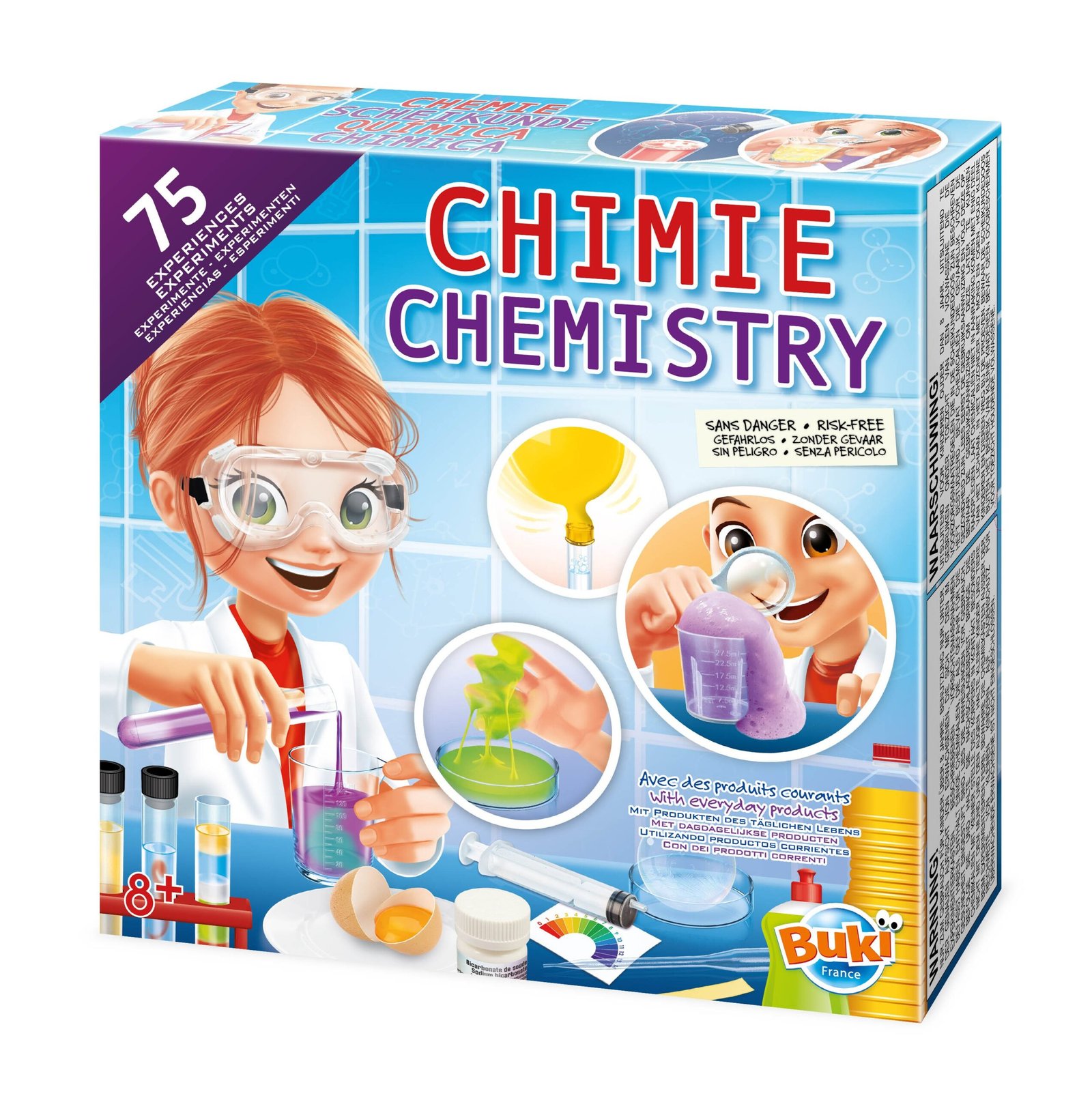 Avec ce coffret complet, l’enfant peut réaliser 75 expériences sans produits chimiques dangereux : utilise du sel, du vinaigre ou de la farine pour découvrir — par exemple : lequel est le plus acide entre l’eau et le jus d’orange ? Comment flottent des objets lourds ? Comment se forment les nuages ?