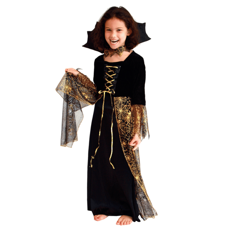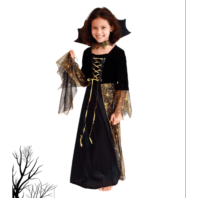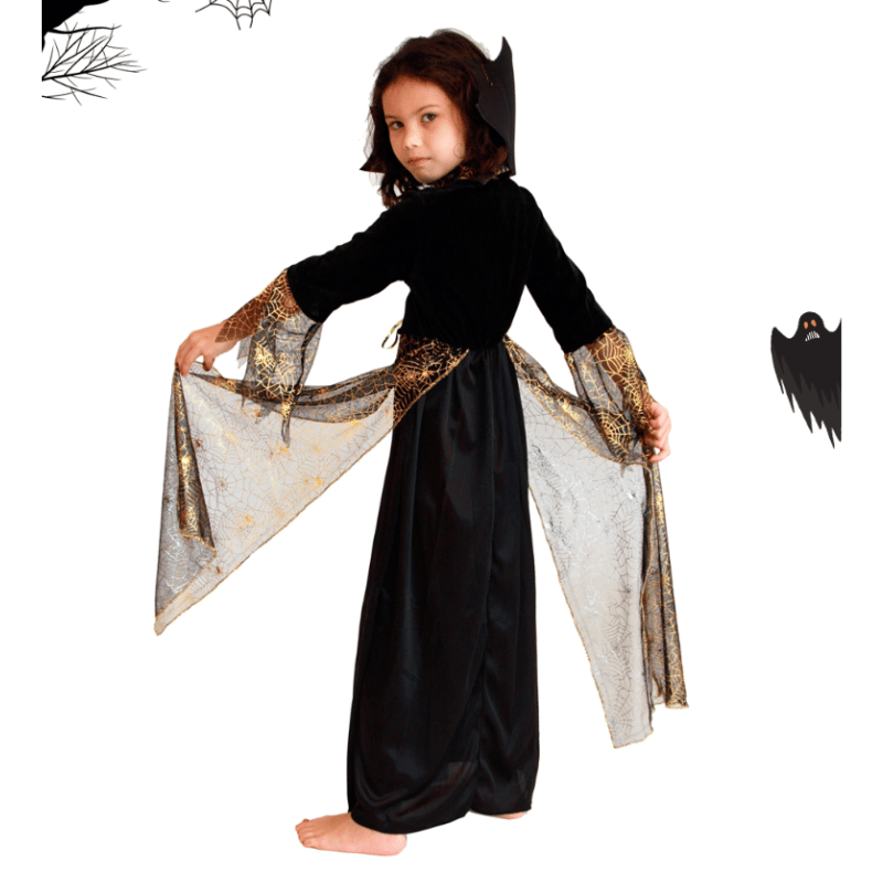 Une robe noire et dorée élégante, inspirée des araignées enchantées d’Halloween, parfaite pour les petites filles qui adorent briller tout en faisant frissonner 👻.