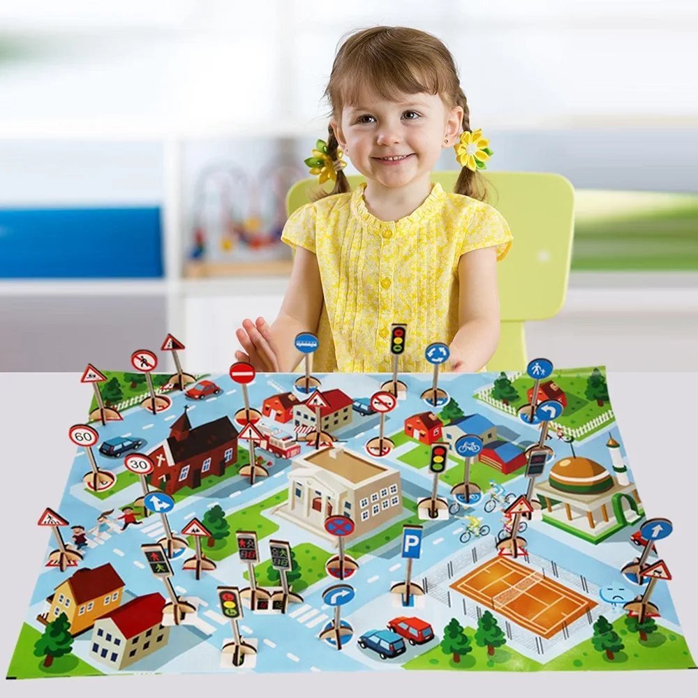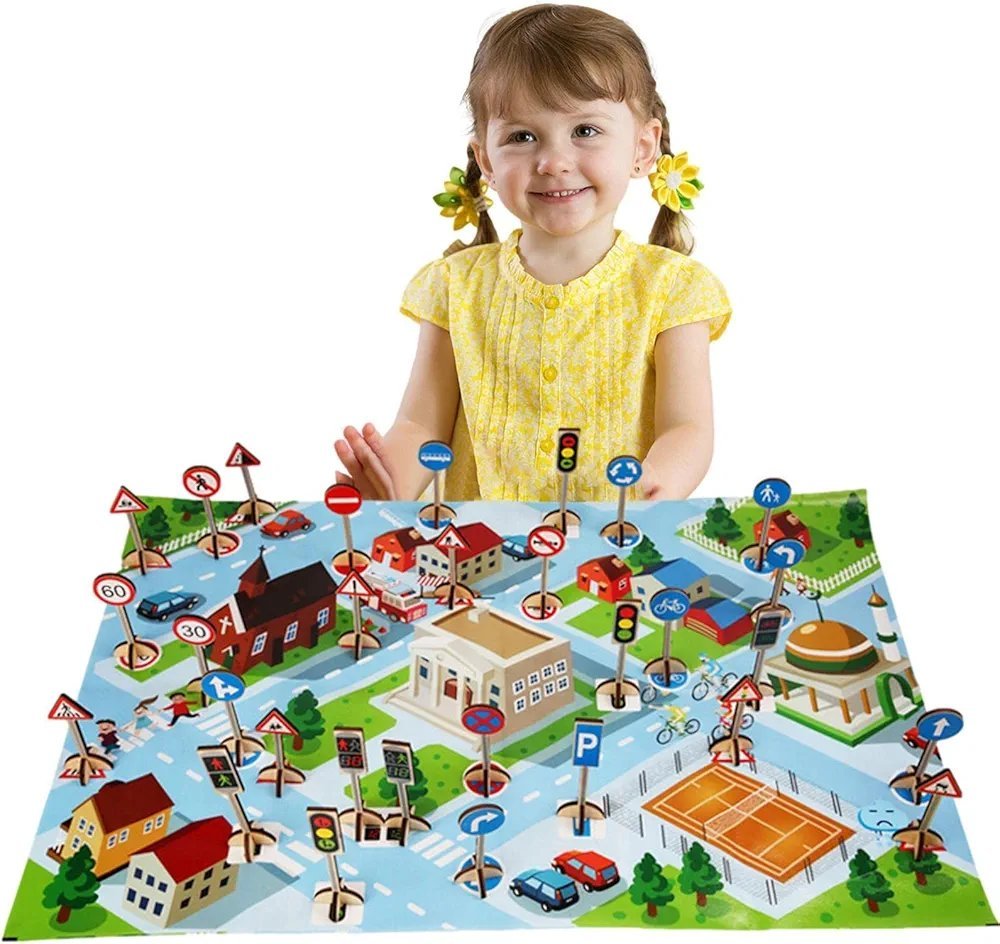 composé de panneaux routiers en bois et d’un tapis illustré représentant une ville.