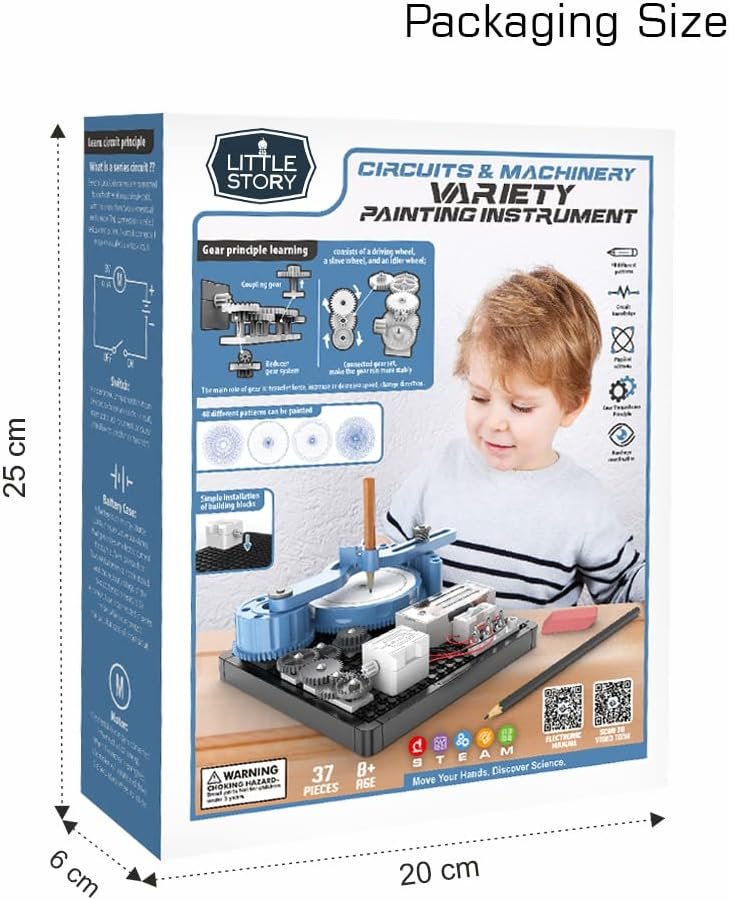 L’enfant assemble les pièces, connecte le moteur, place un crayon et observe la machine dessiner