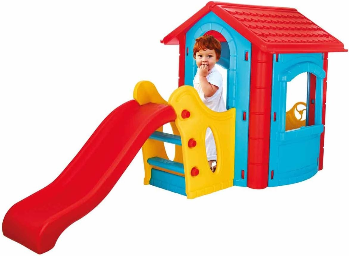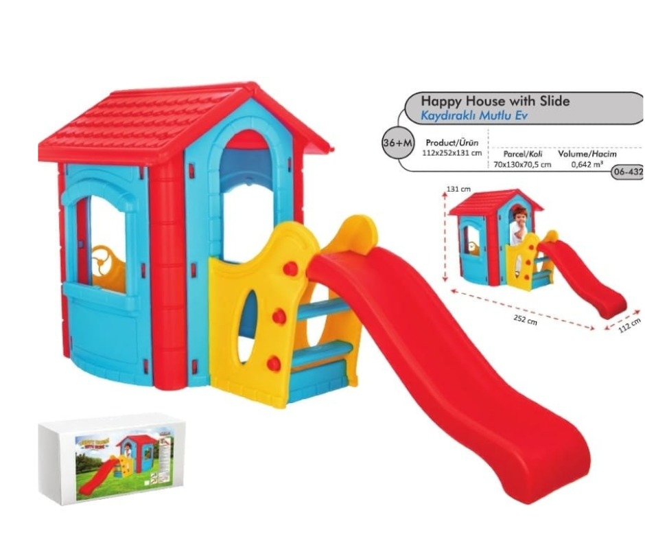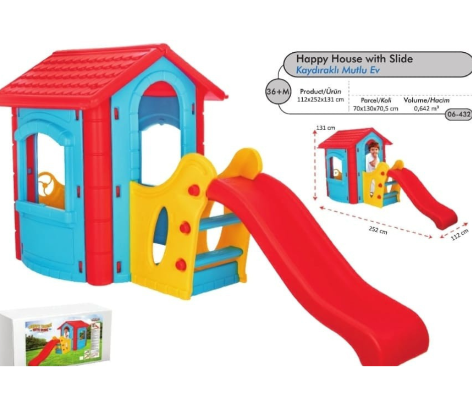 Découvrez la maisonnette Happy House avec toboggan intégré.