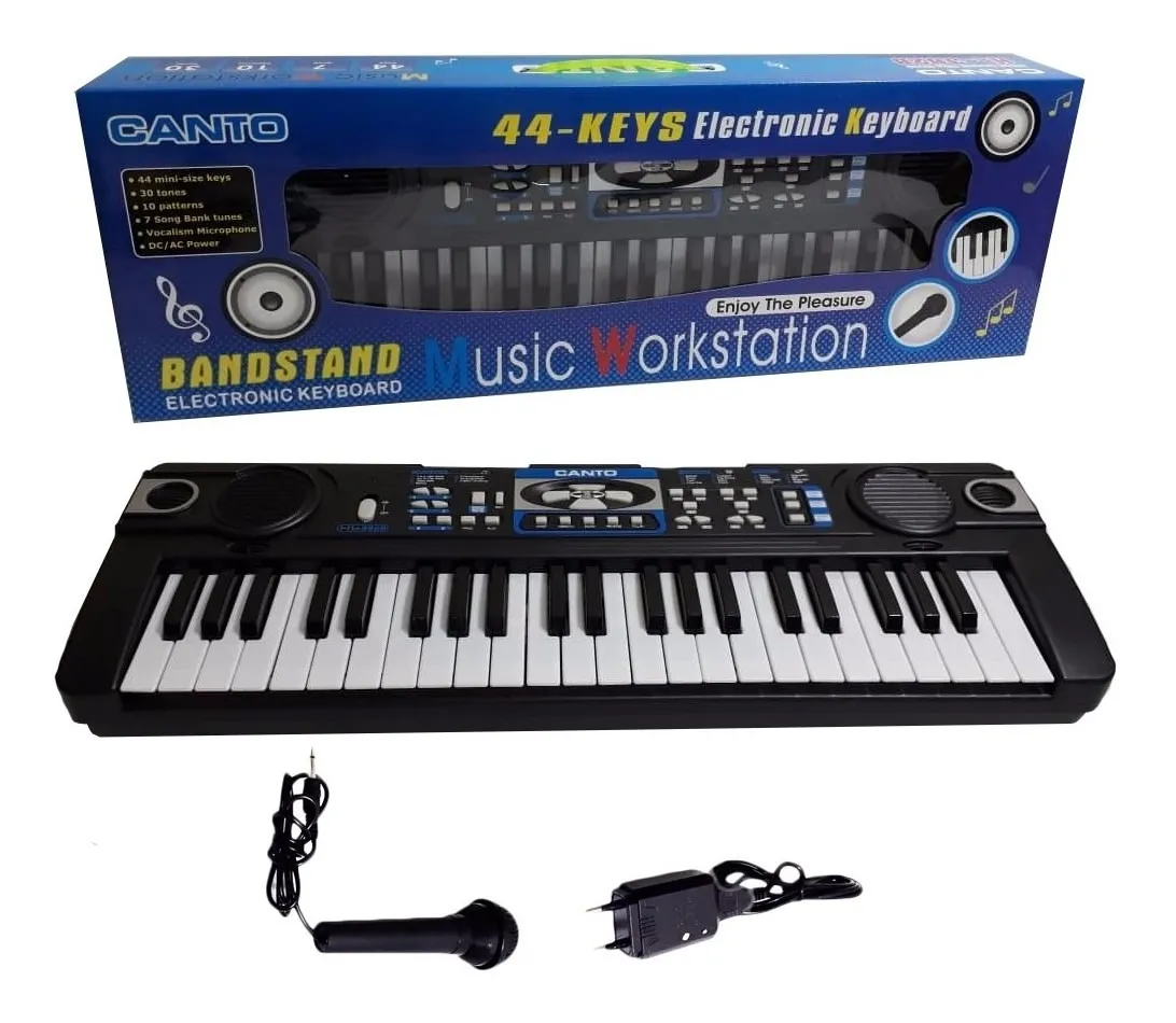 Le clavier électronique CANTO 44 touches est une excellente première station de musique pour les enfants. Compact et ludique, il propose des sons variés (timbres), des rythmes d’accompagnement et plusieurs chansons de démonstration pour apprendre en s’amusant. Grâce au micro fourni, les petits musiciens peuvent chanter en jouant. Parfait pour développer l’oreille musicale, la coordination et la créativité à la maison ou à l’école.